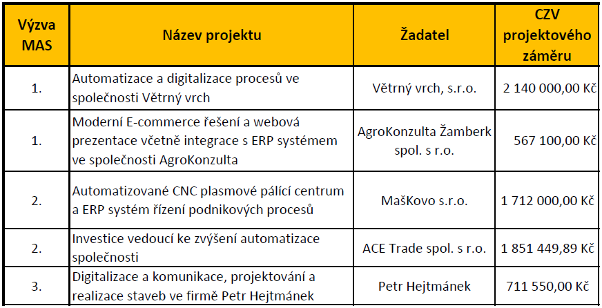 Níže uvedené INVESTIČNÍ projekty jsou aktuálně realizovány podpořenými žadateli. Po úspěšném ukončení projektu žadatelem (tj. po pořízení investice a po proplacení dotace) bude možné projekty zhlédnout v sekci: „Úspěšně ukončené projekty“.