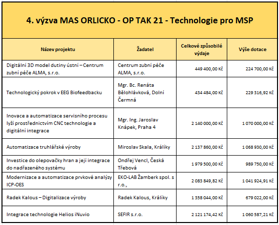Níže uvedené projekty jsou aktuálně realizovány podpořenými žadateli z Operačního programu Technologie a aplikace pro konkurenceschopnost. Po úspěšném ukončení realizace projektů žadateli (tj. po proplacení dotace) je bude možné zhlédnout v sekci: „Úspěšně ukončené projekty“.
