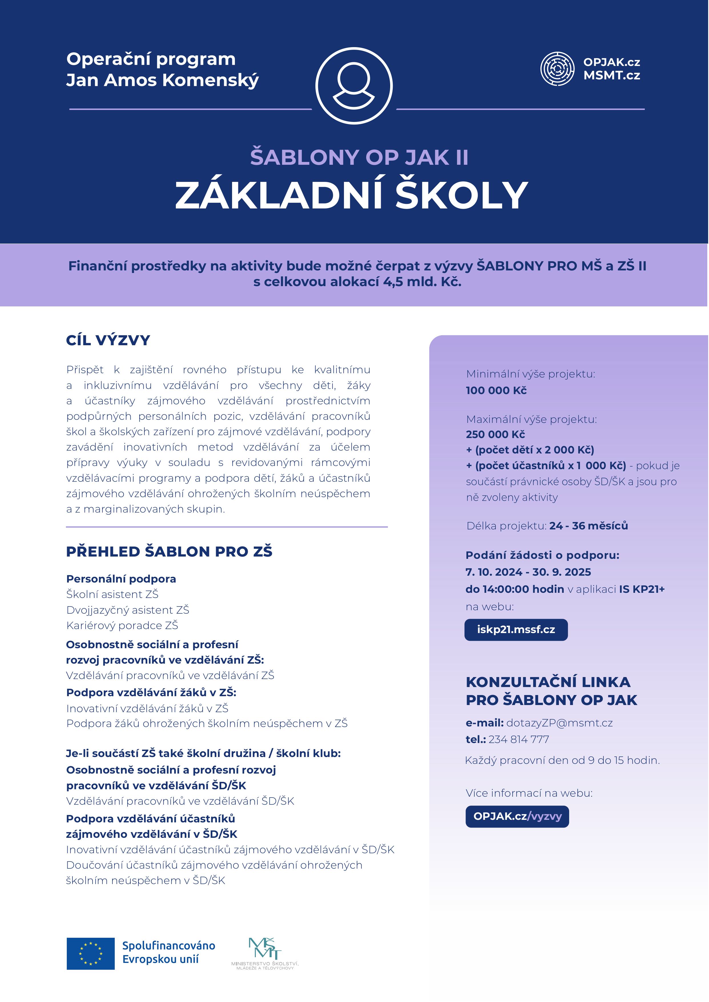 | Šablony pro MŠ a ZŠ II | od 7. 10. 2024 do 30. 9. 2025, 14:00 | 31. 12. 2028 |